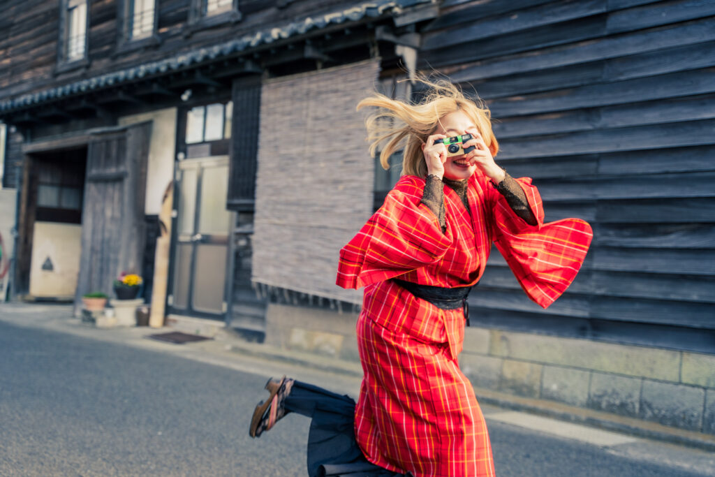奈半利に広がる昭和レトロな町並みを背景に、スマホのカメラでは出せない、フィルムカメラのような写真の色合いを引き出します。