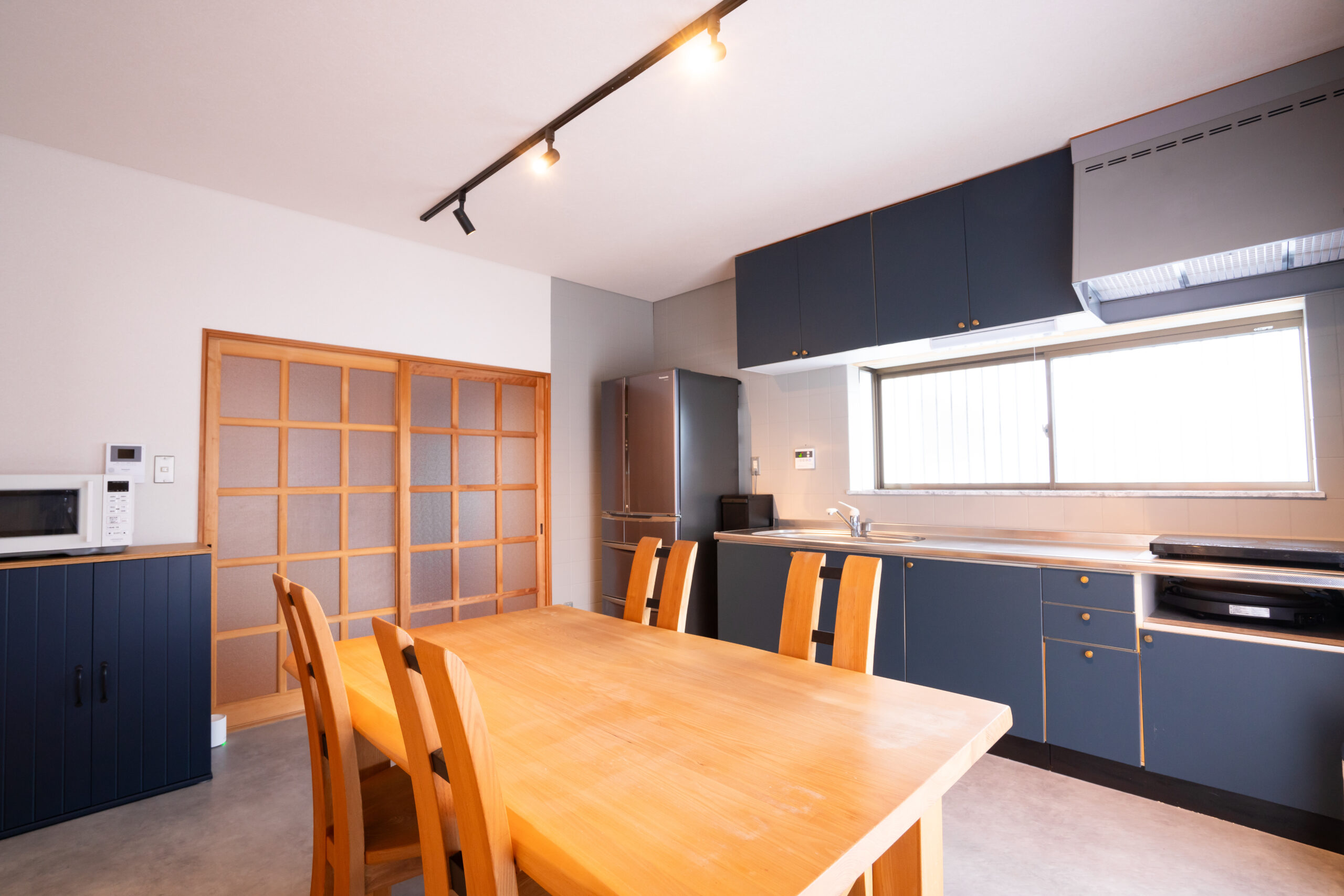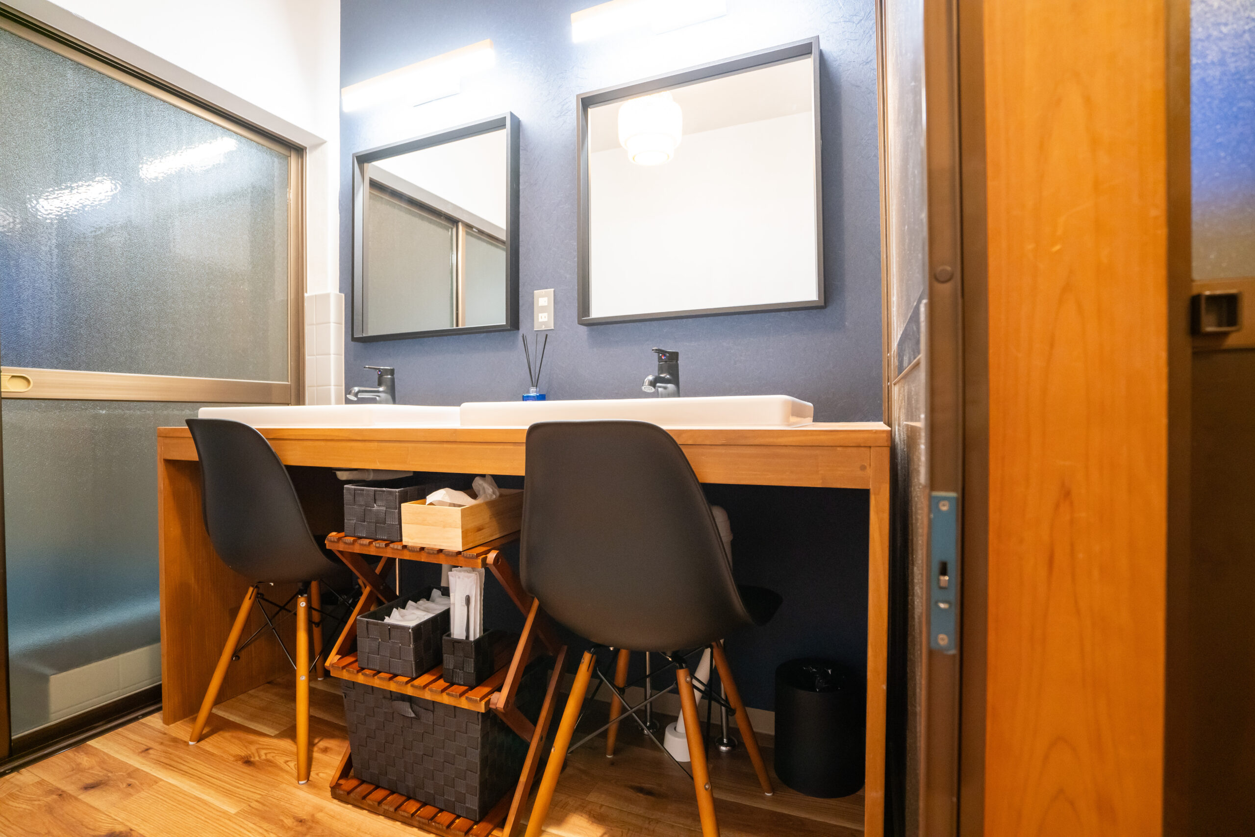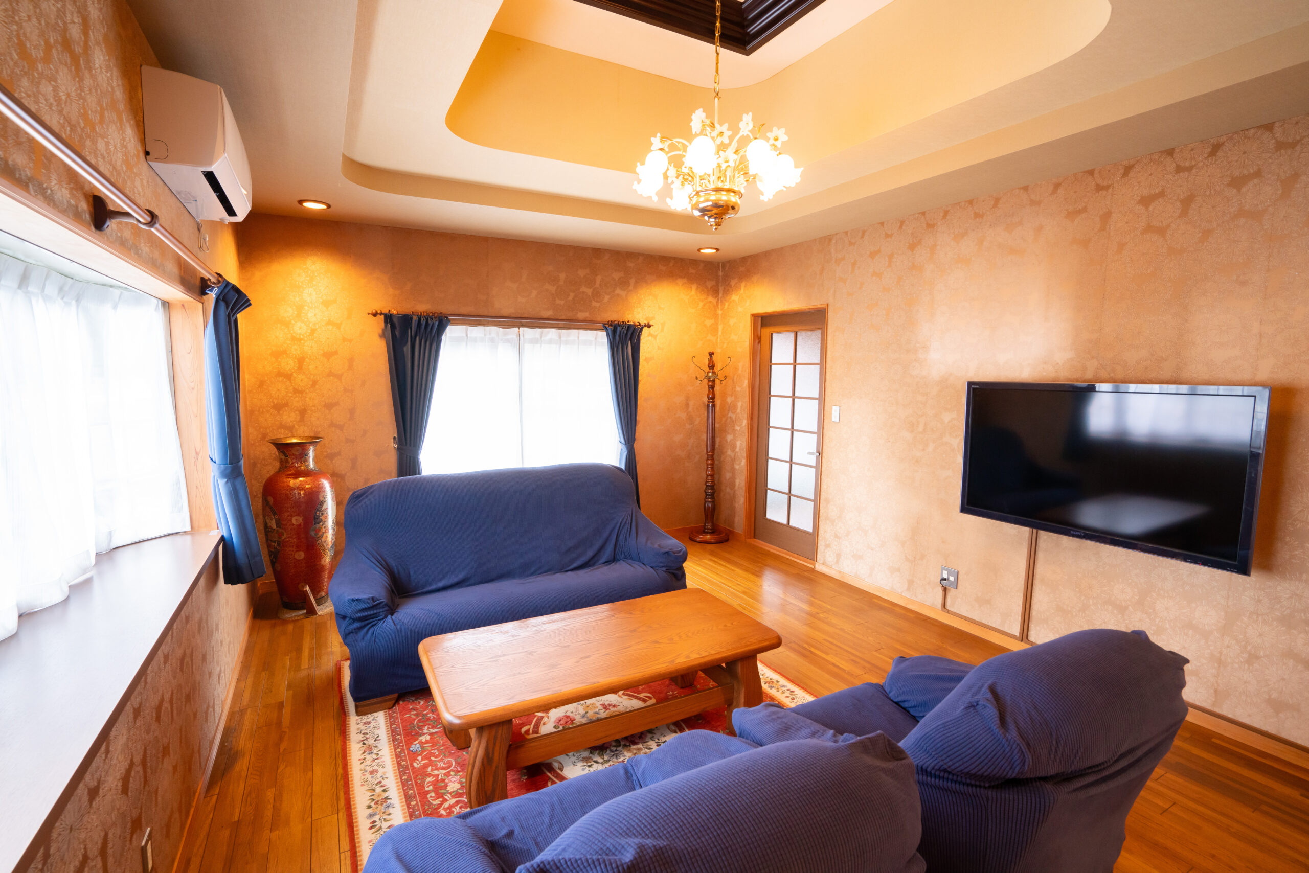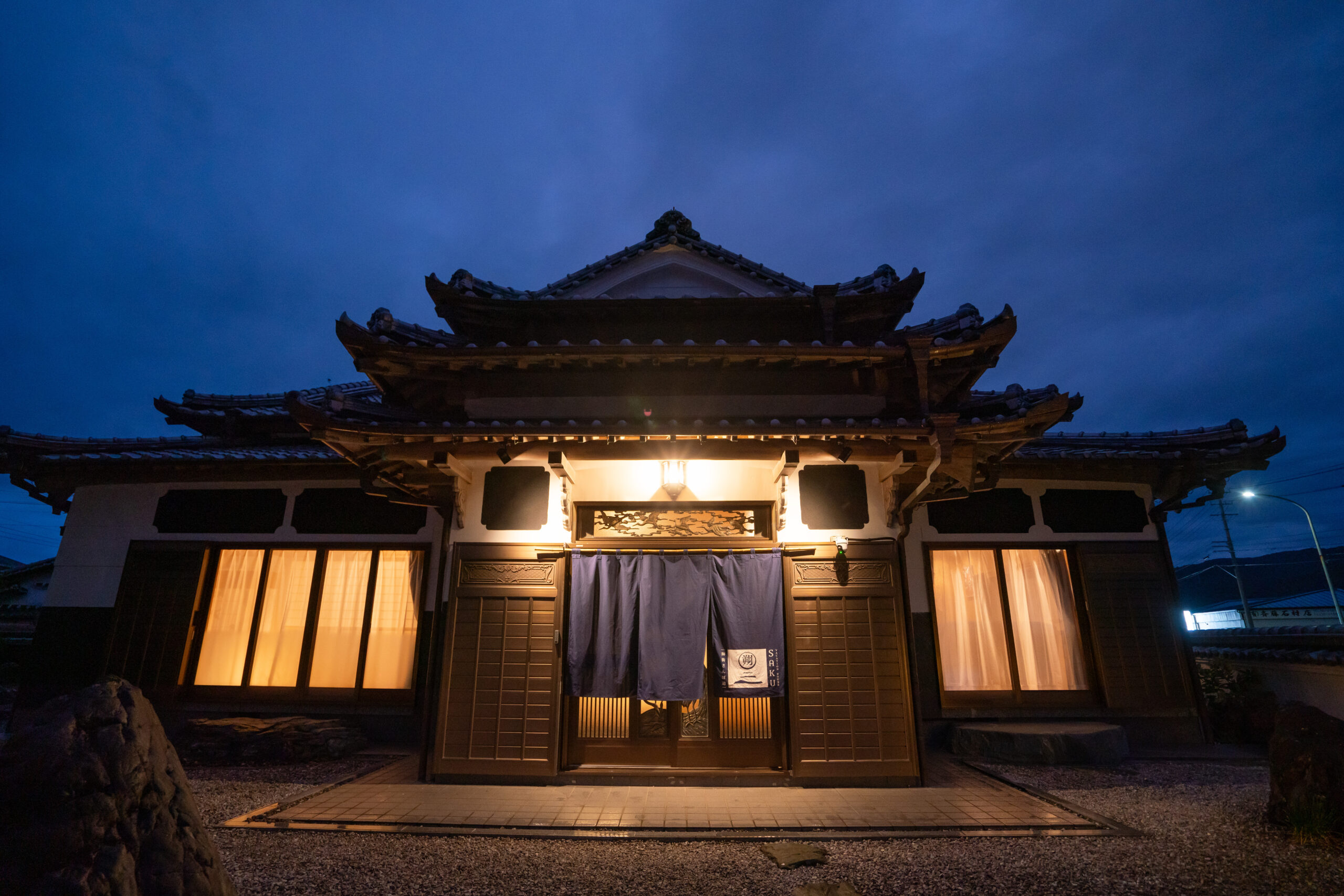 そうして2024年12月末、ホテルへの改装が完了しました。正面玄関には海を連想させるような濃紺の暖簾を。親族が大事にしていた骨董品も綺麗に展示。
